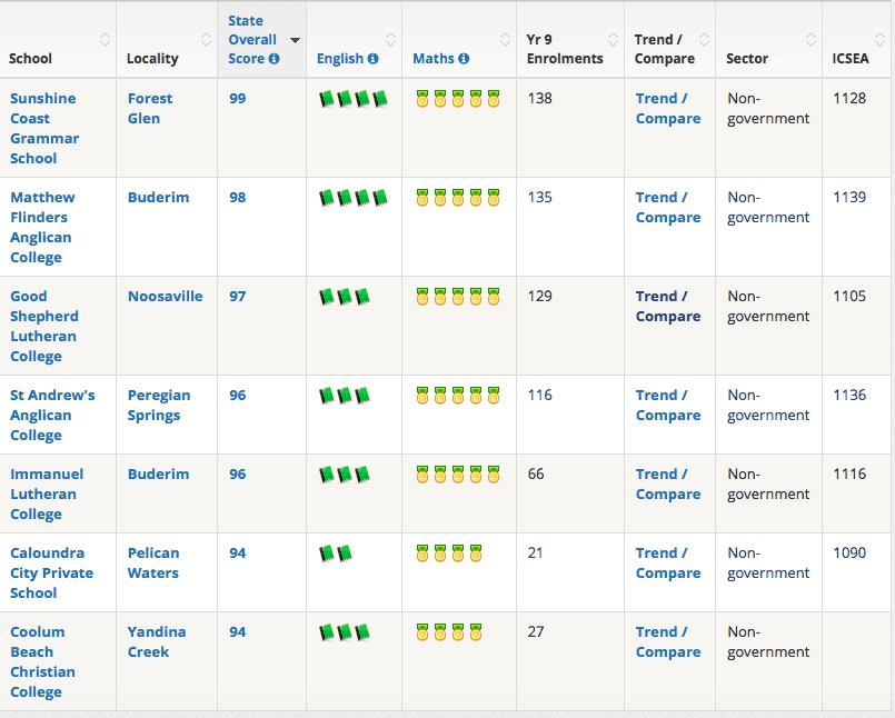 Another great resource is www.bettereducation.com.au, which publishes a list of top educational facilities according to various academic results. Here’s an example of one of their analyses of Sunshine Coast high schools: