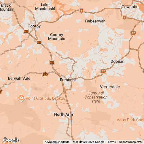 The Sunshine Coast stretches roughly 60 km from Caloundra in the south to Noosa in the north, with the hinterland sweeping inland to the Glass House Mountains.
